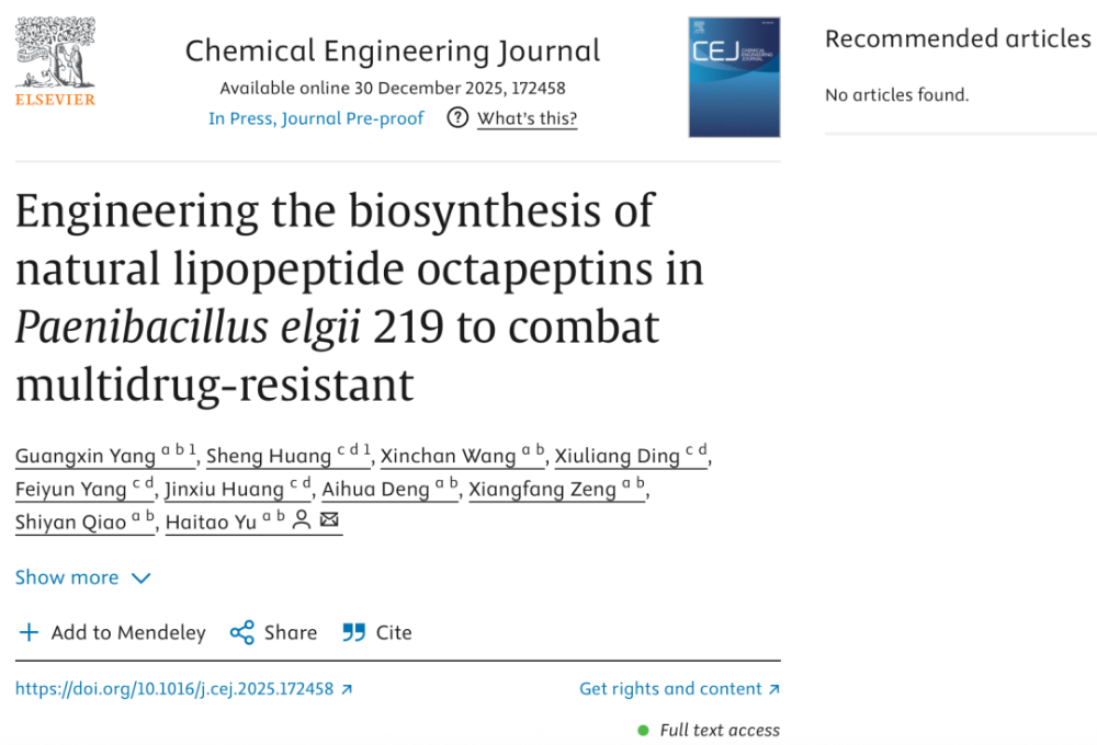 近日,中国农业大学谯仕彦院士团队于海涛副教授在化学工程顶刊《化学工程杂志》发表重磅研究:成功构建非模式菌株抗菌肽生物制造平台,通过菌种筛选、发酵优化、ARTP诱变、基因编辑等系统技术,将八肽菌素产量从毫克级跃升至3.94g/L,创下全球最高滴度纪录,为畜牧养殖业“减抗替抗”扫清了关键的量产障碍。